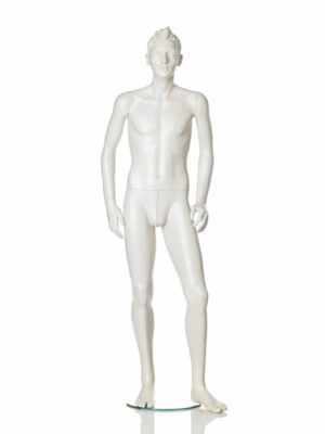 Stilistisk herre mannequin fra Hindsgaul med hænderne foran. Den rå overflade og de reducerede ansigtsudtryk giver mannequinen et køligt, moderne udtryk. Et stilsikkert valg, både med og uden paryk.